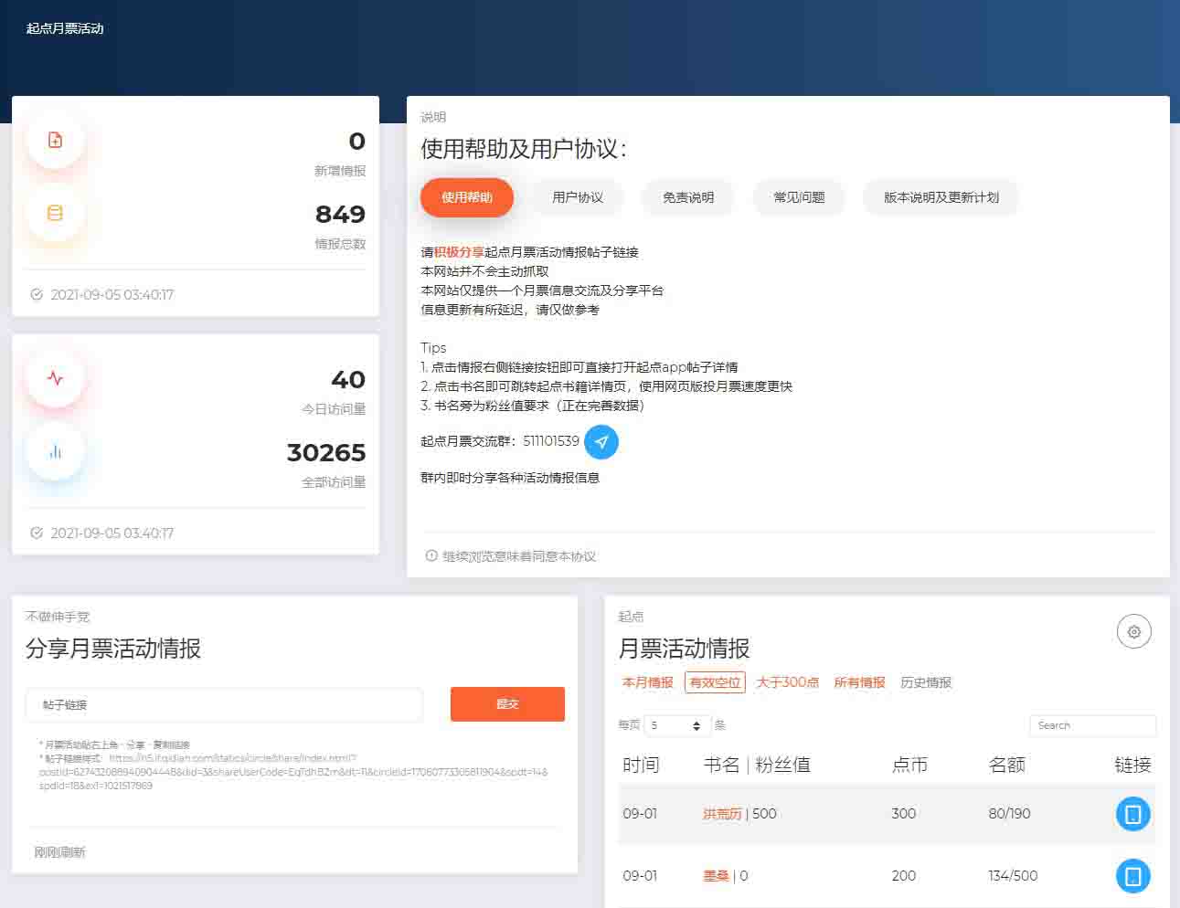 An information bulletin board website aims to collect event information for Qidian readers to quick search. This is not a crawler site. All the data comes from the sharing of users. The average daily visits are around 300, and the highest is over 2000.