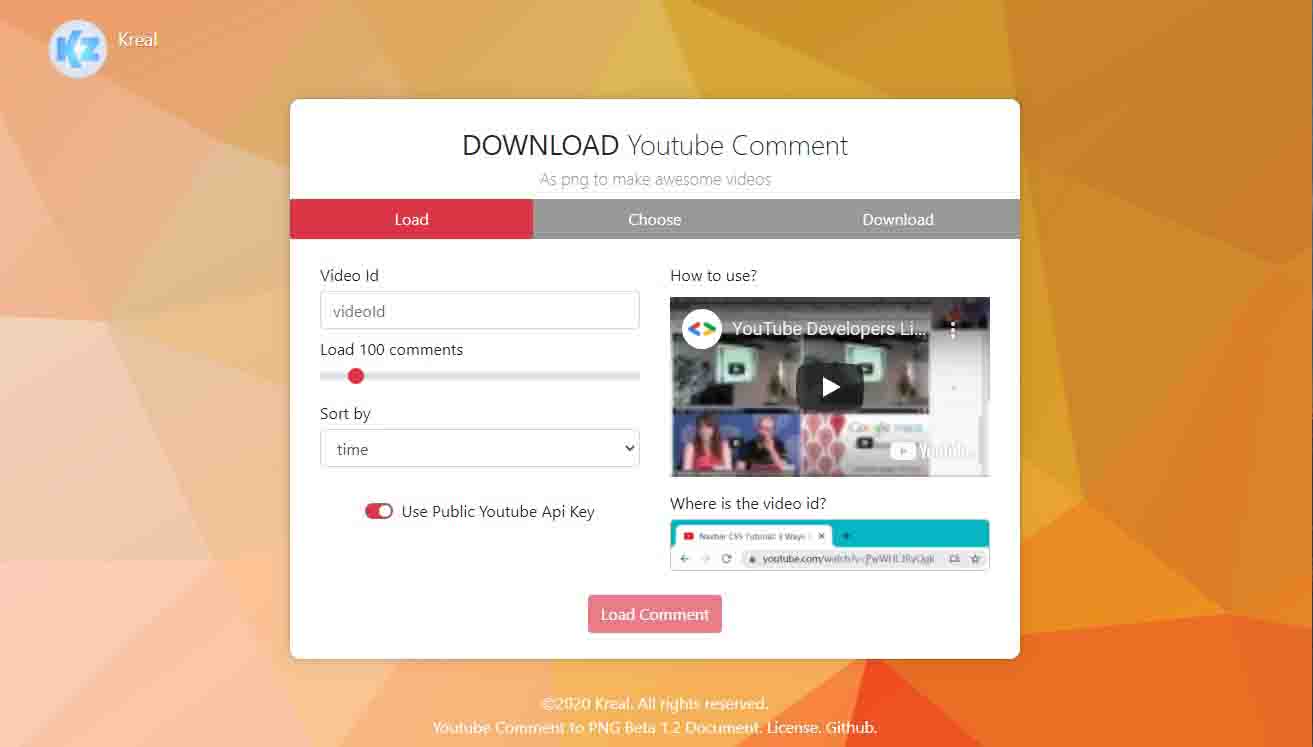 A convenient website for Youtubers to download video comments. Use YouTube developer API to get video comments data, use HTML and CSS to reformat and save them in PNG format (Canvas2png) for compressed download.